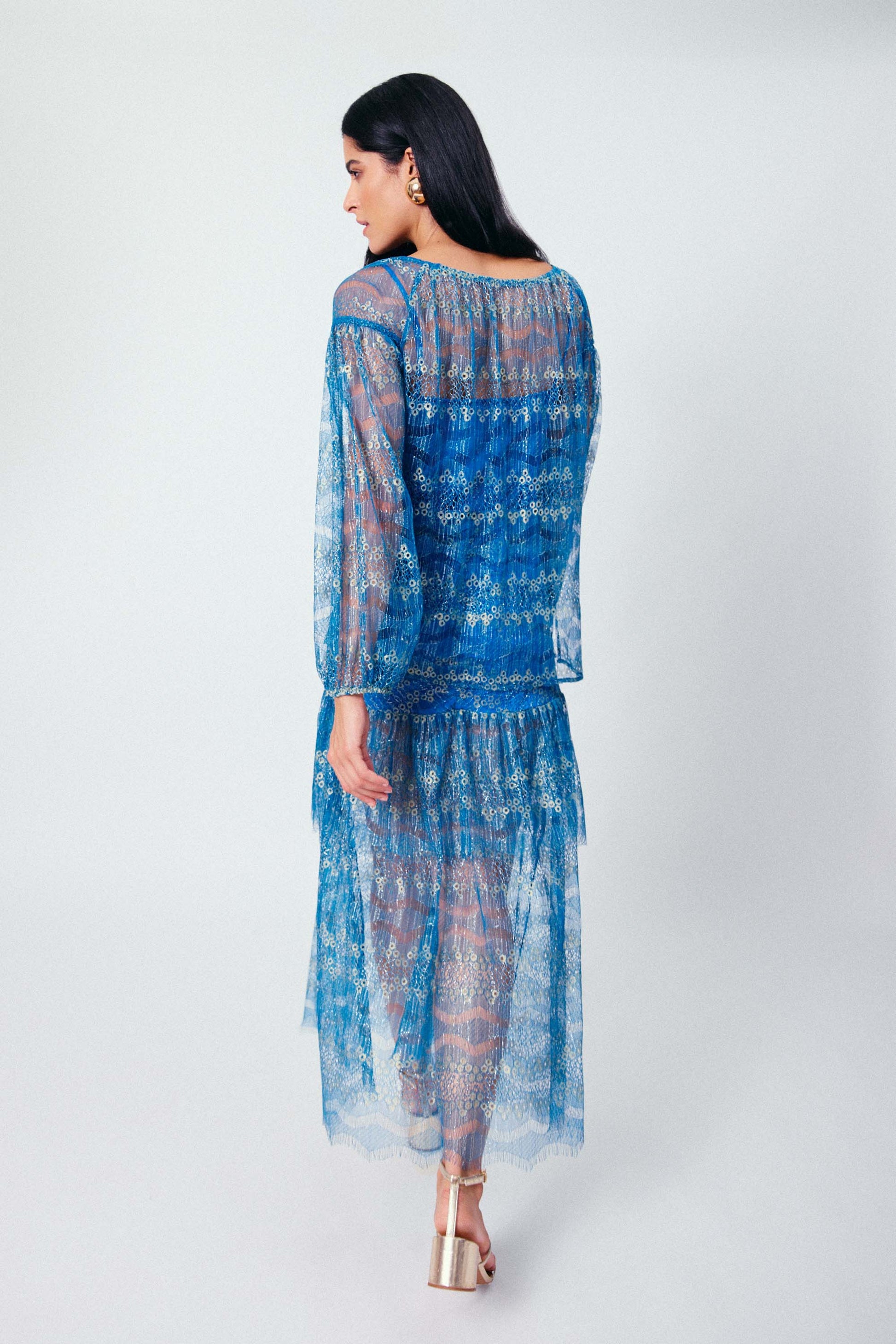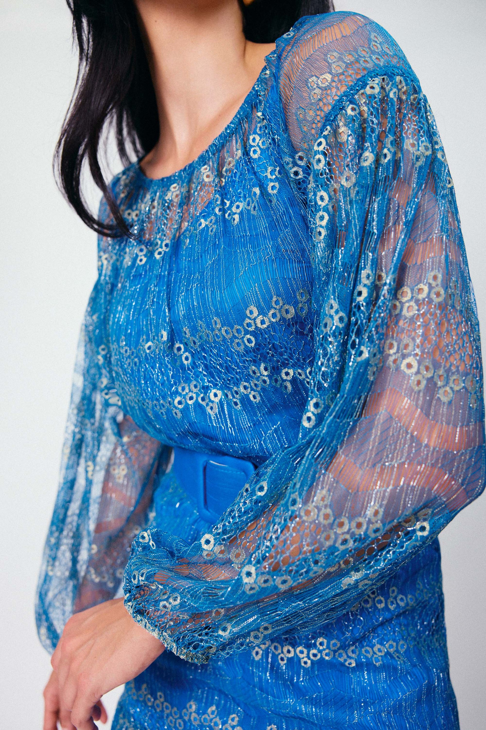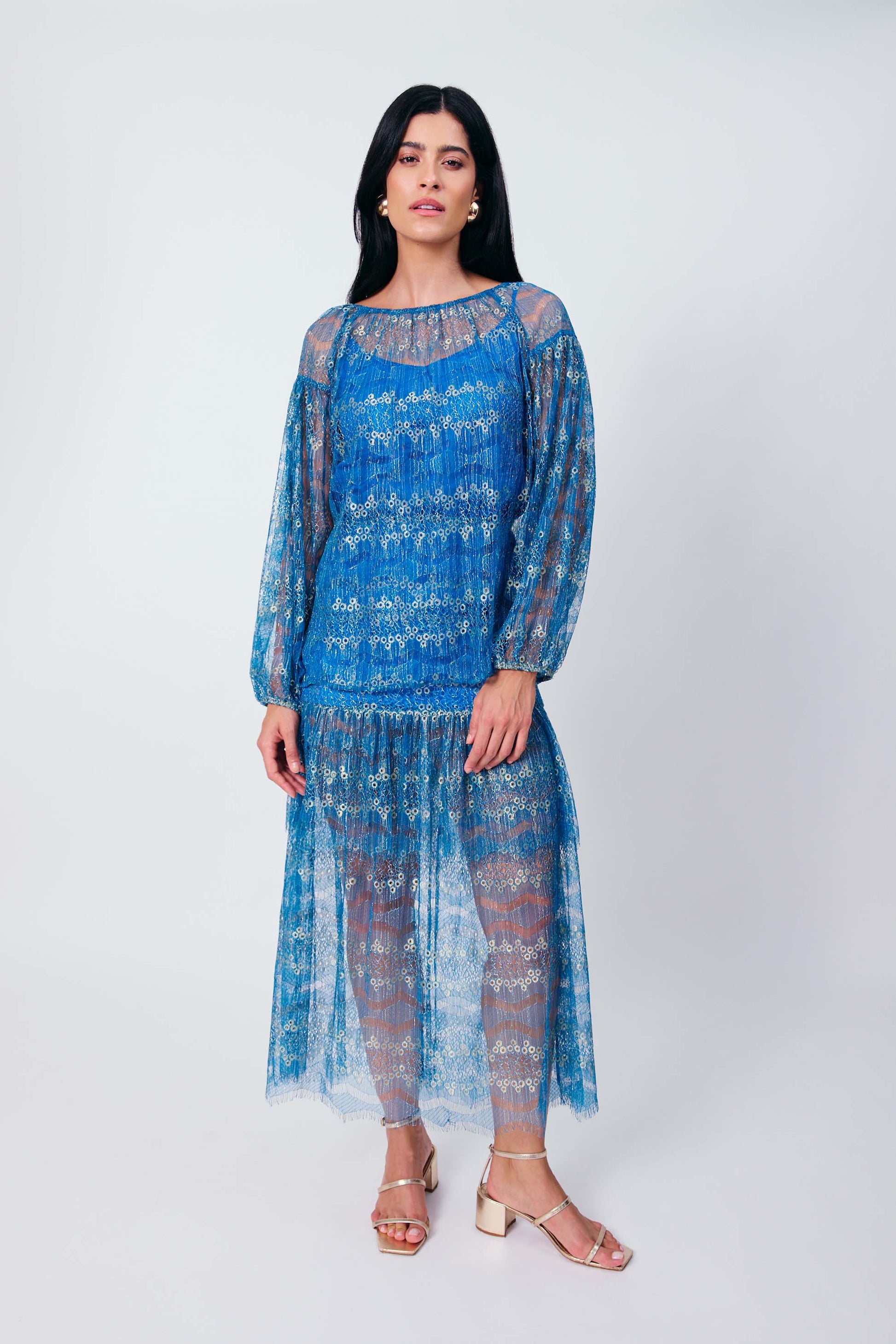 A Blusa Manga Longa com Combinação Safira é pura poesia em forma de look. Feita em renda com brilho dourado discreto e transparência sofisticada, ela tem caimento leve e toque macio, perfeito para momentos que pedem charme e delicadeza. As mangas longas ganham volume sutil com punhos franzidos por elástico, trazendo um efeito romântico e fluido. A barra com acabamento a fio reforça o ar etéreo da peça. Para maior conforto e versatilidade, a blusa acompanha uma regata de forro em viscose com alças reguláveis, ideal para quem busca leveza sem abrir mão da segurança ao vestir.