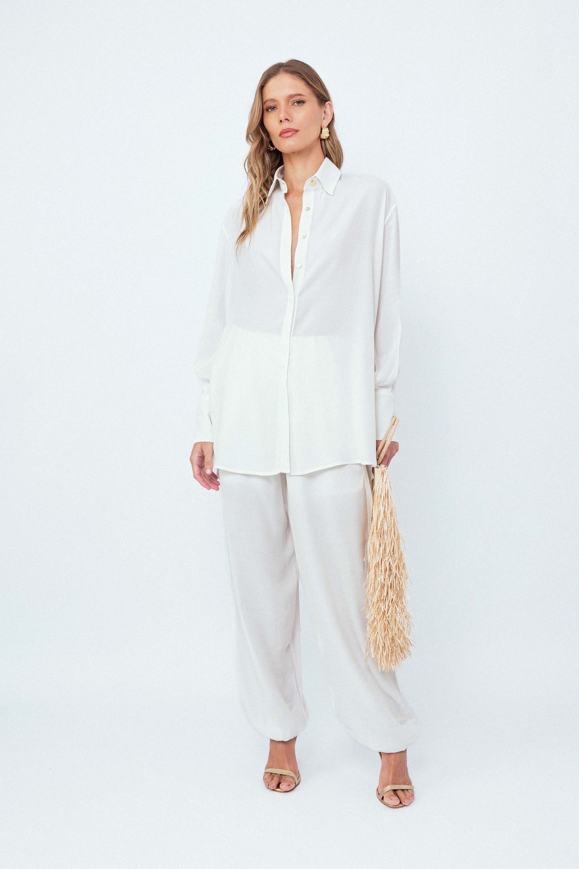 A clássica camisa de botão, repensada para um visual leve, descomplicado e cheio de frescor. A Camisa Essencial tem modelagem ampla, punhos largos e vista invisível, que valoriza o caimento limpo da peça. O diferencial fica por conta do acabamento em viés a fio, um detalhe que traz movimento e reforça o ar easy e elegante da composição.