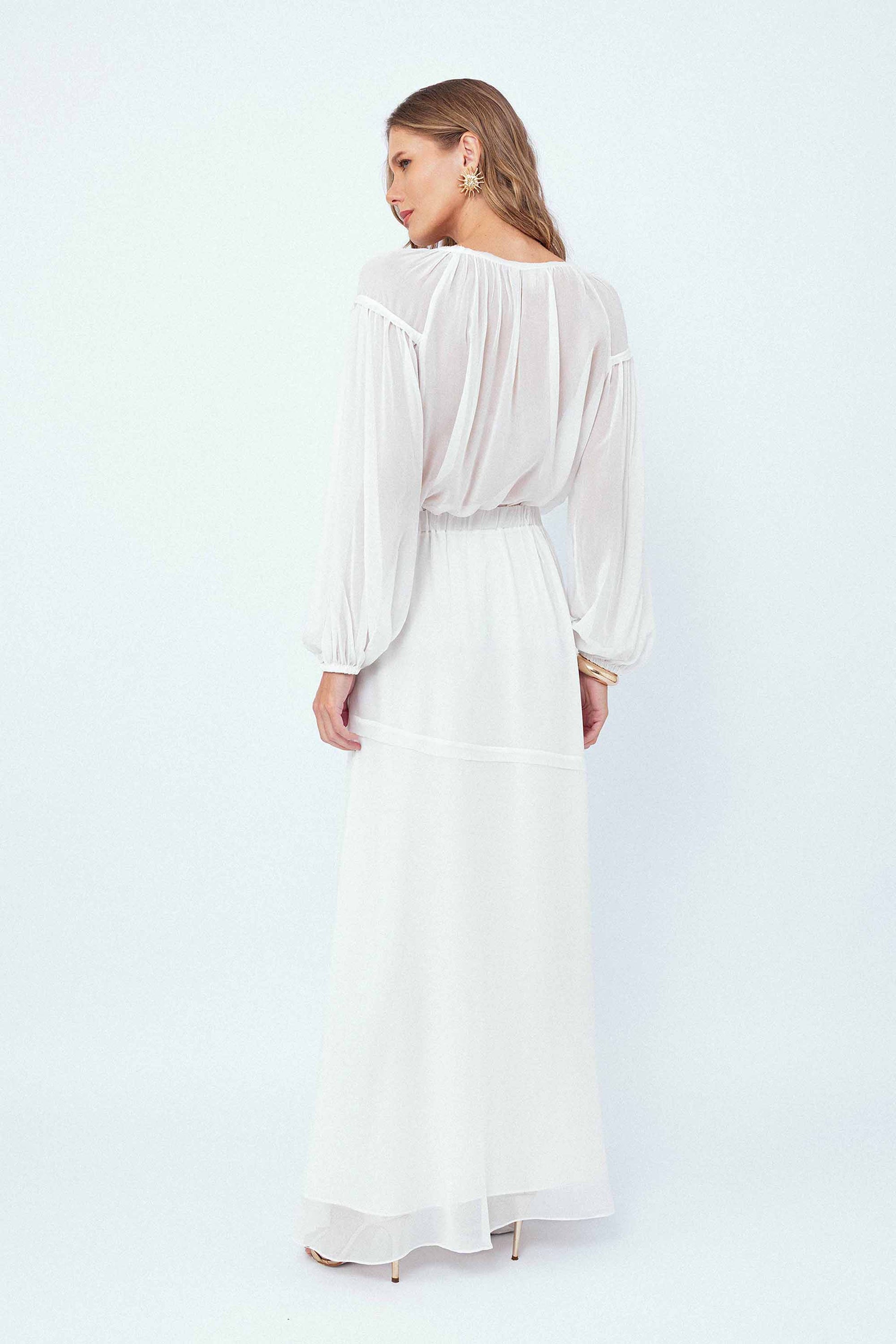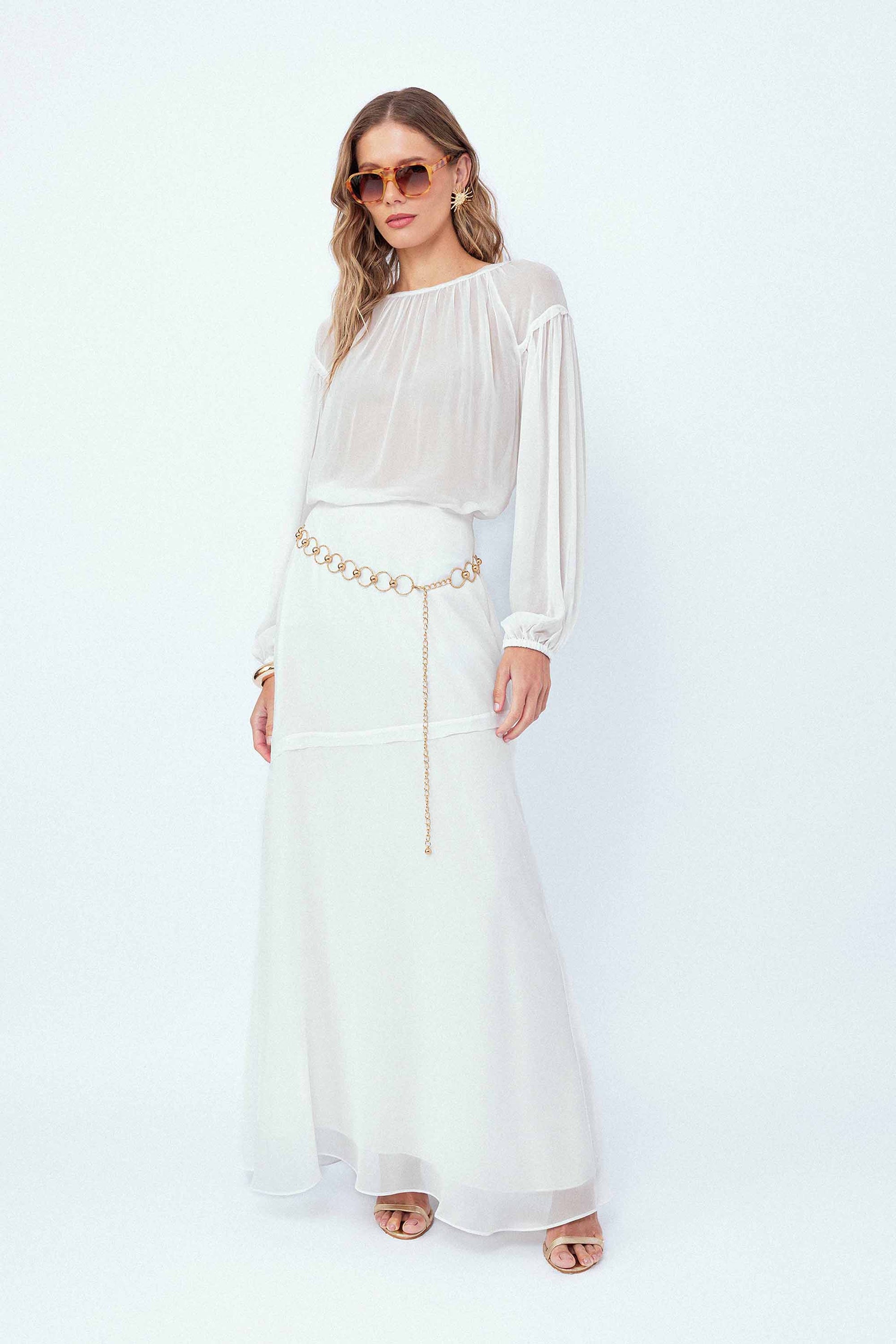 Para uma proposta mais fluida e monocromática, combine com a Blusa Manga Longa Pétalas Off White — criando um visual coeso, elegante e leve, perfeito para eventos diurnos ou noturnos com sofisticação.