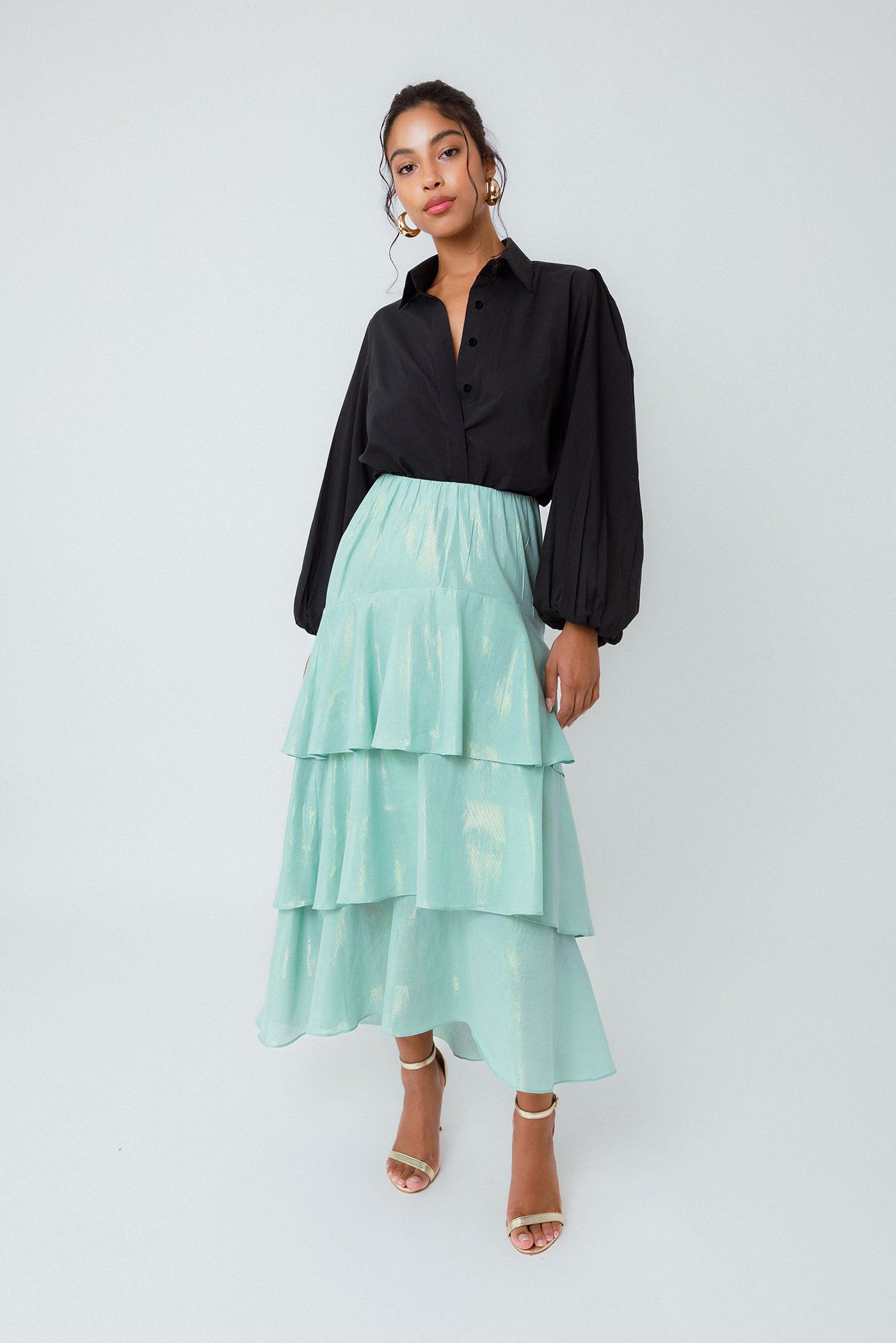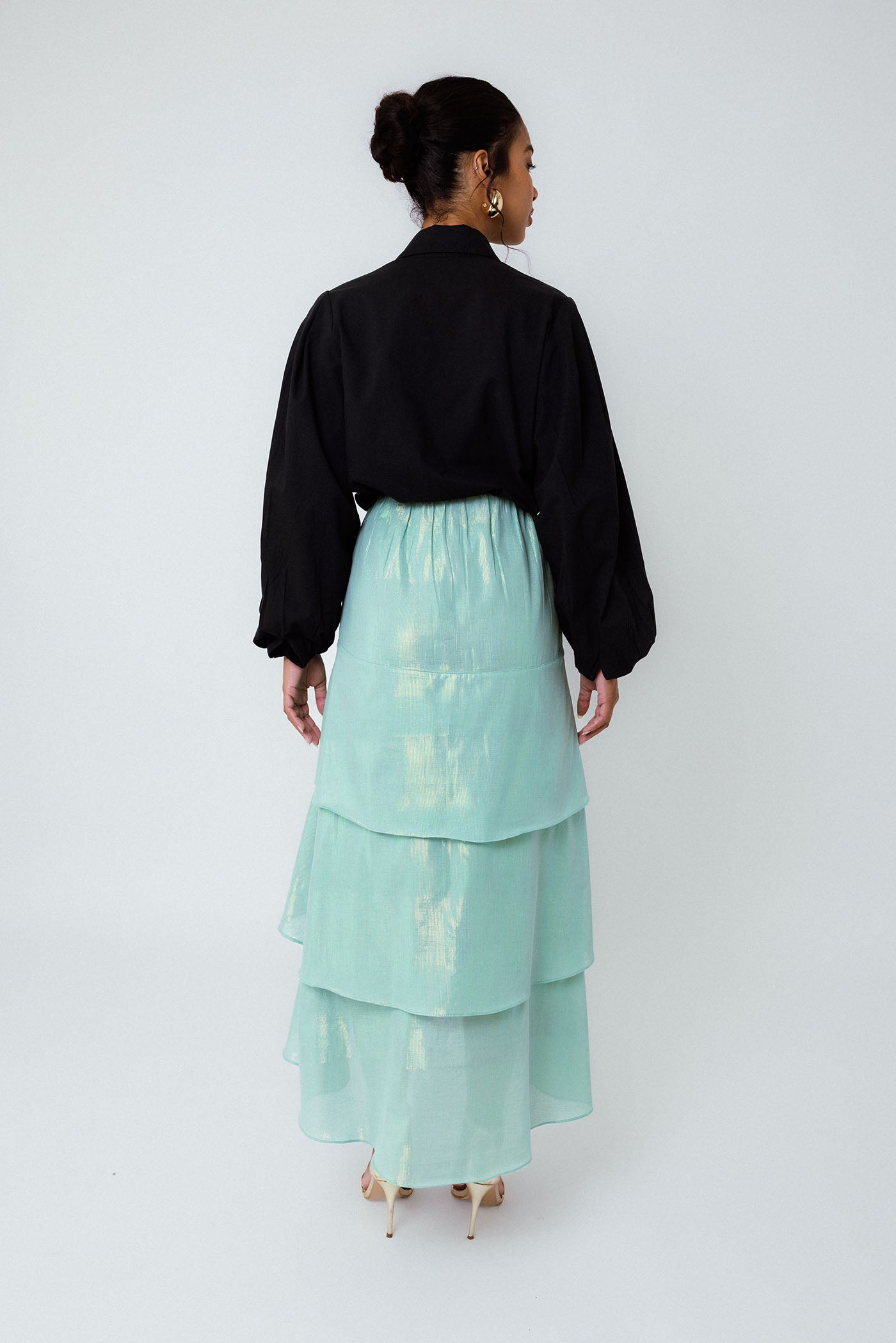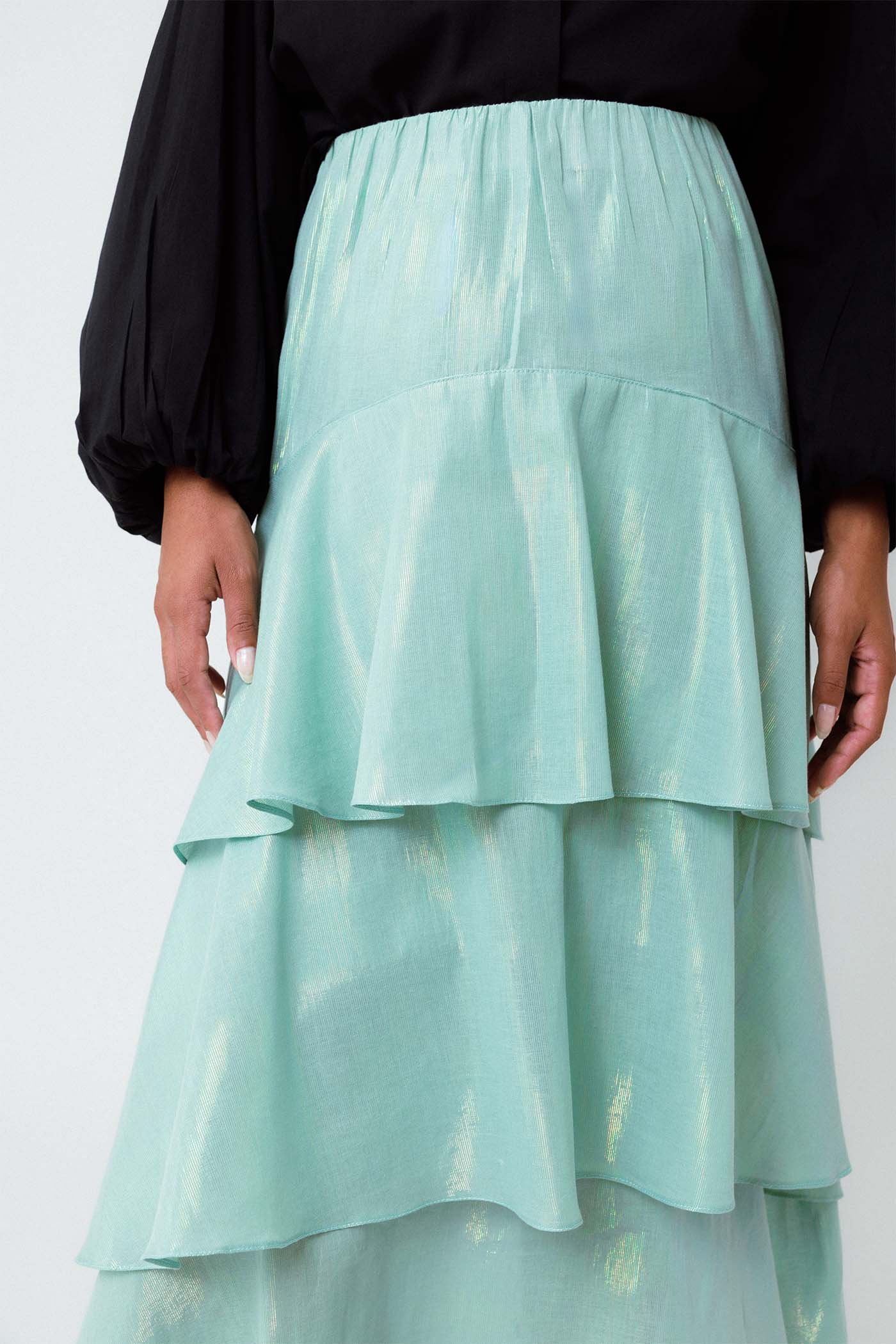 A Saia Midi Camadas da Família Lago aposta em movimento e presença com suas três camadas amplas e bem marcadas. Confeccionada em cambraia de algodão, o tecido revela um leve brilho metálico que reflete a luz com sofisticação. O elástico interno no cós garante praticidade e encaixe confortável na cintura, enquanto o corte em camadas adiciona volume e leveza ao visual.
