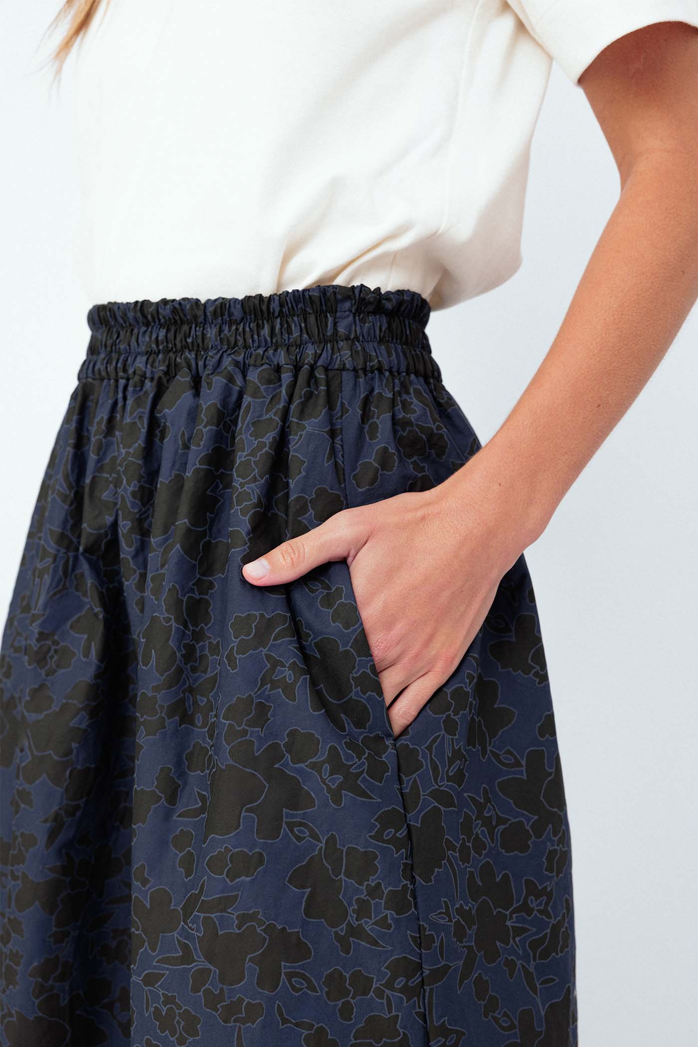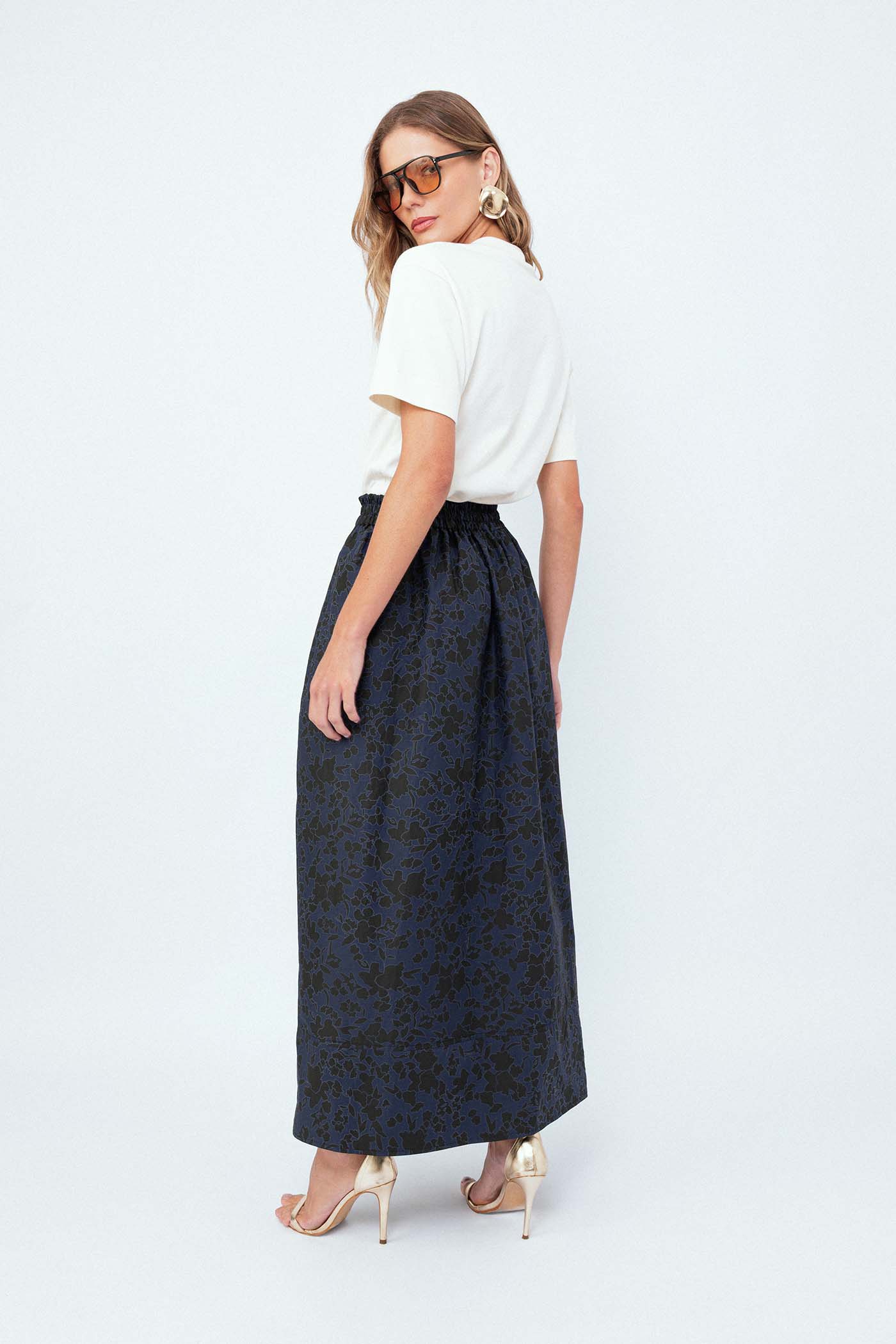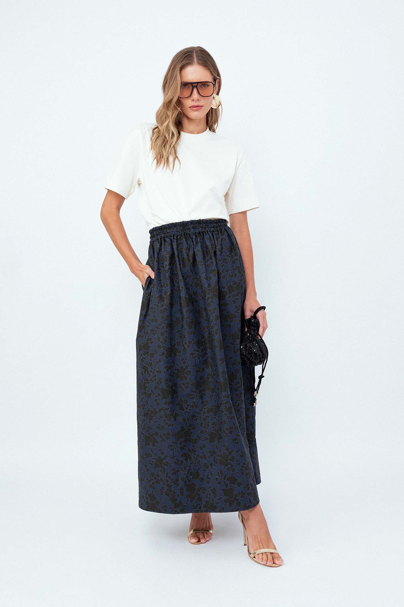 A estampa de um floral sutil em marinho e preto é perfeita para criar combinações que vão do casual ao sofisticado. O comprimento longo e a barra larga conferem um toque moderno e descontraído, tornando-a uma peça indispensável no guarda-roupa.