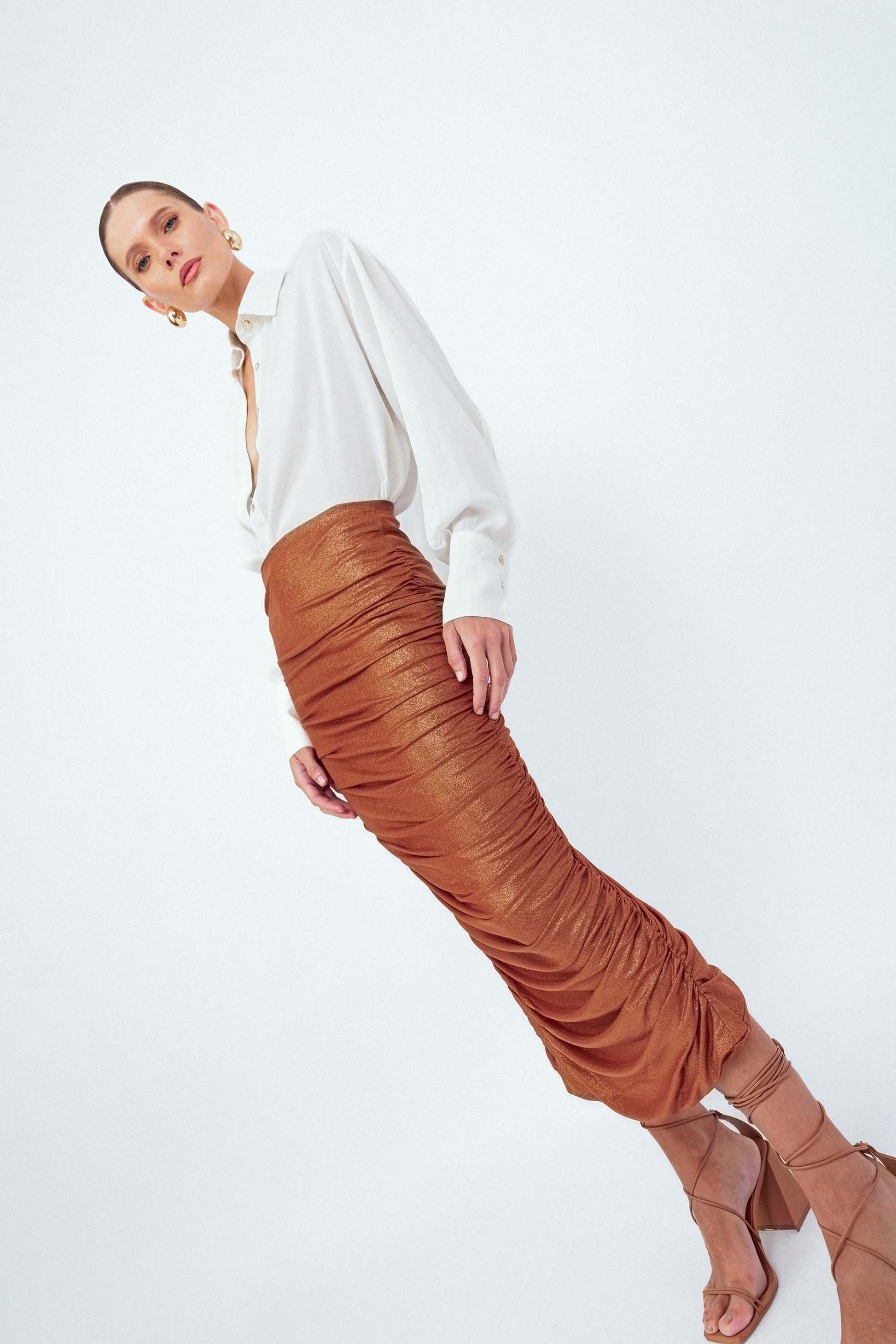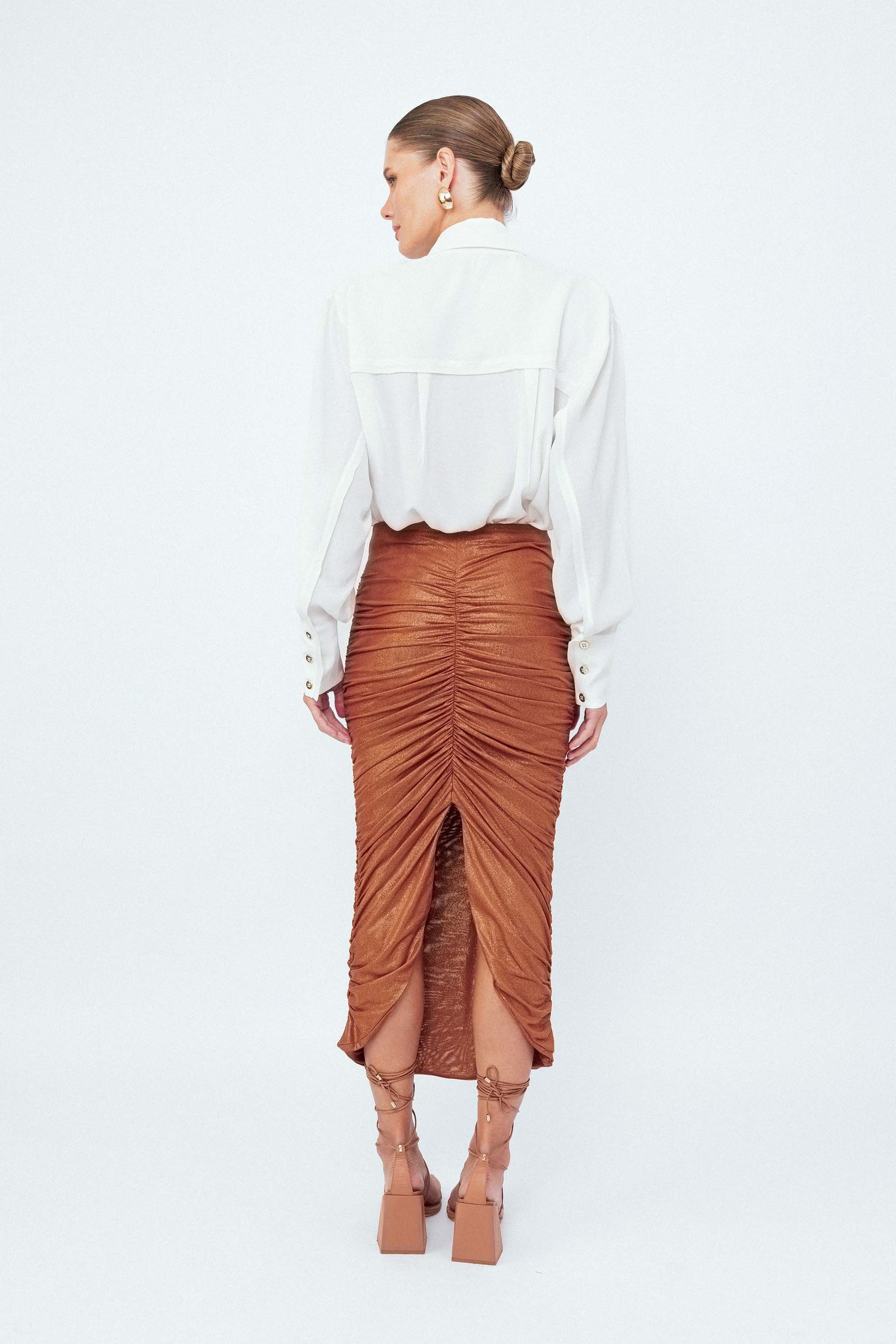 A peça que rouba a cena sem esforço. A Saia Midi Franzida Pôr do Sol tem caimento ajustado ao corpo com franzidos estratégicos que valorizam a silhueta e criam um efeito elegante. O comprimento midi equilibra sofisticação e sensualidade, enquanto a fenda nas costas garante liberdade de movimento e um charme a mais. Com elástico na cintura e forro completo, ela une conforto e impacto visual.