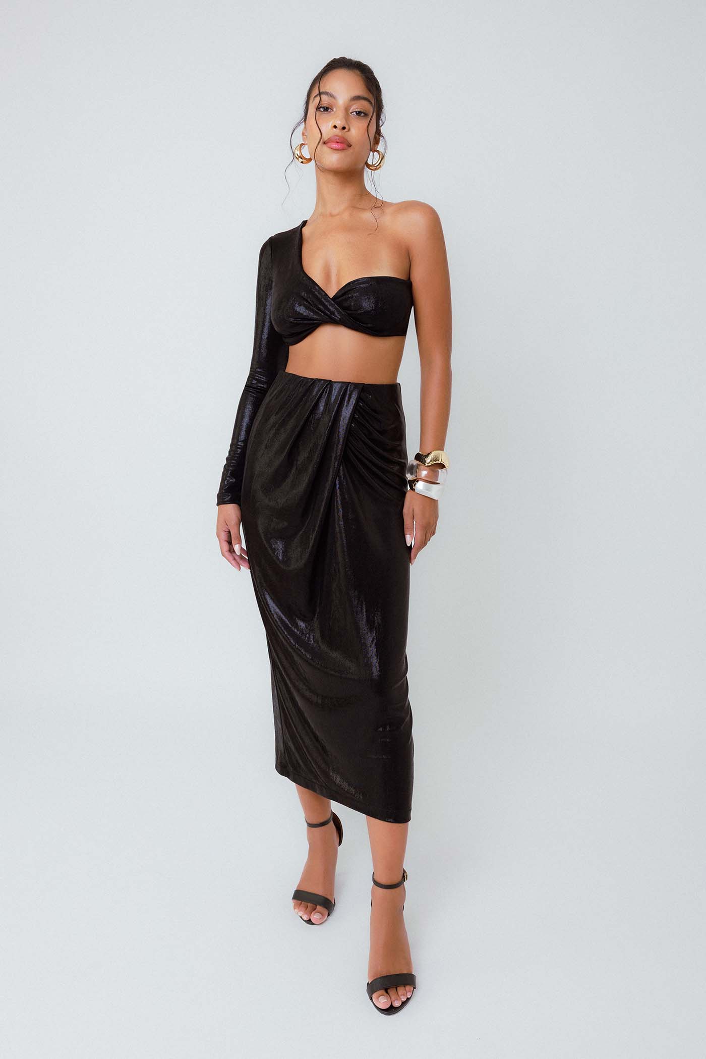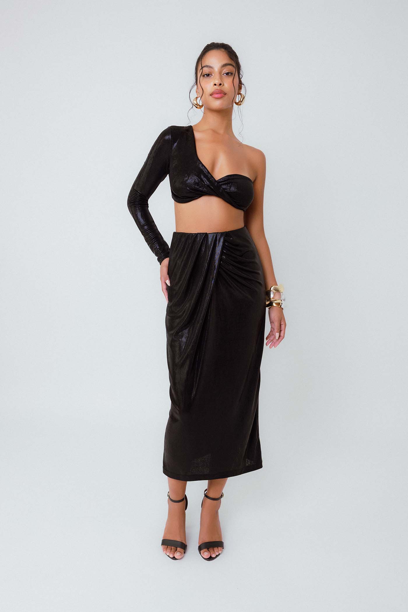 Use com a Saia Midi Pregas Reflexo Preta para um conjunto marcante e monocromático, ideal para eventos noturnos ou festas especiais. Também pode ser combinado com peças mais básicas para deixar o top brilhar como protagonista do look. Um salto e acessórios metálicos completam perfeitamente a produção.