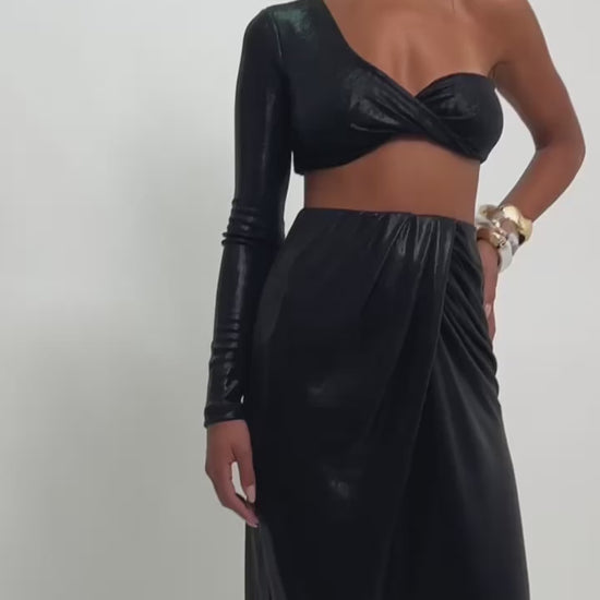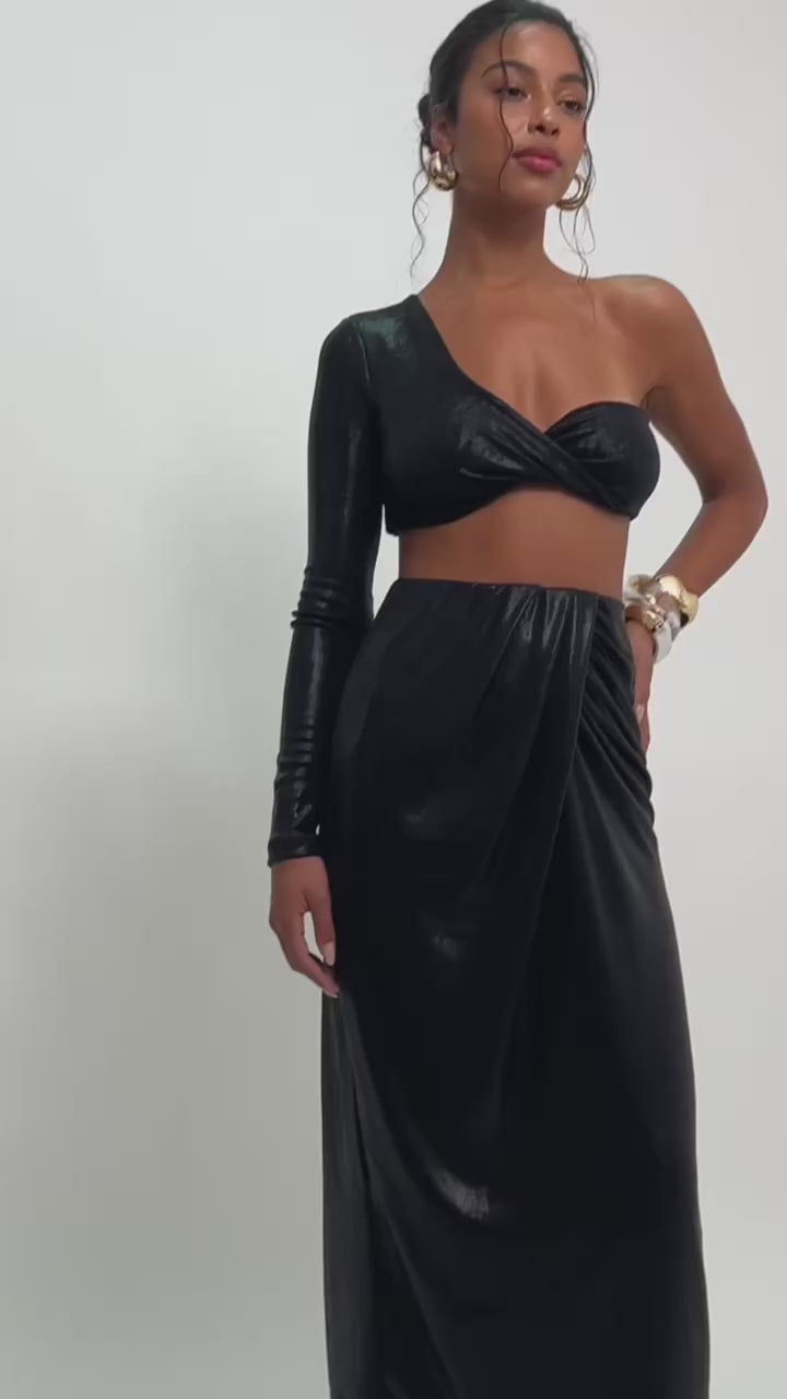 O Top Nó Assimétrico Reflexo Preto é pura presença. Feito exclusivamente na nossa Malha Glow, ele combina um brilho sofisticado com um toque macio e confortável. O modelo de um ombro só com torção frontal valoriza o colo e traz uma proposta elegante com um toque de ousadia. A manga longa única equilibra a assimetria e deixa o look impactante mesmo em composições minimalistas.
