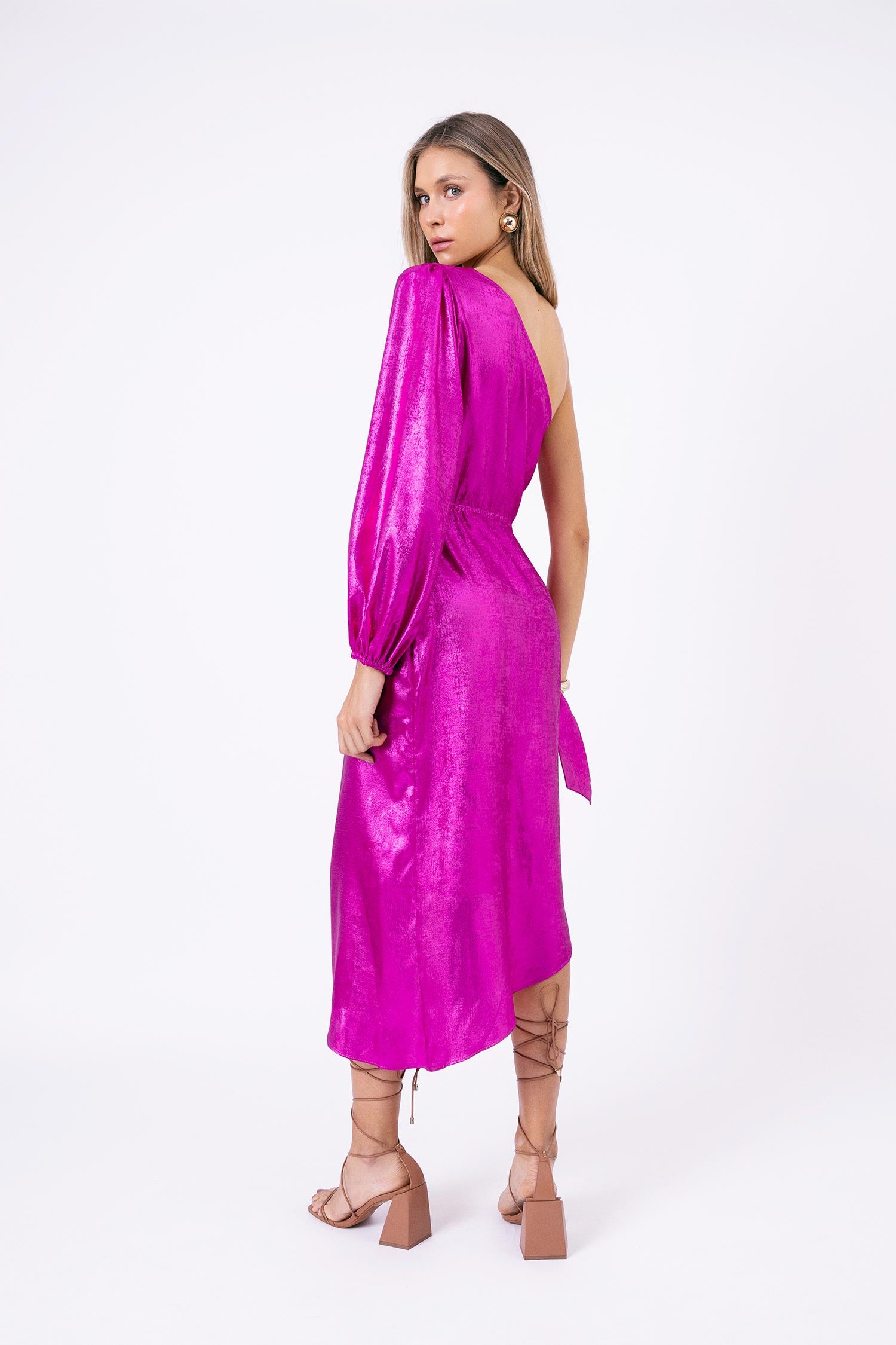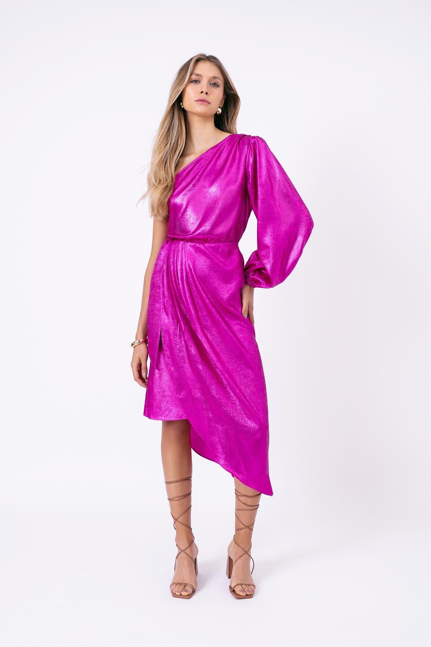 Se você quer roubar a cena, esse vestido assimétrico é o look perfeito! Com um ombro só e um tecido cintilante em fúcsia que brilha na medida certa, ele traz um toque moderno e cheio de estilo para as festas mais especiais. A saia midi com pregas e faixa na lateral alonga a silhueta e adiciona movimento ao look, enquanto a manga volumosa cria um contraste ousado e sofisticado. O ajuste confortável na cintura realça suas curvas, garantindo que você brilhe com elegância e conforto.